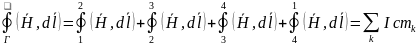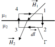 ля Н: В качестве замкнутой траектории рассмотрим прямоугольник, две стороны которого параллельны границе раздела магнетиков, и граница делит прямоугольник пополам. Выбираем направление в контуре обхода по часовой стрелке. Тогда
