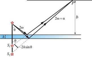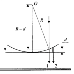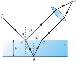 при отражении волны от верхней поверхности пластинки в соответствии с формулами Френеля ее фаза изменяется на π. Поэтому разность фаз δ складываемых волн в точке P равна: