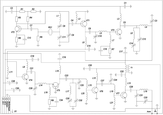 Принципиальная схема платы передатчика приведена на рисунке (см. Рисунок 2). Согласующие цепи СЦ2 – СЦ6 ввиду достаточно высокой рабочей частоты представляют собой Г-образные реактивные цепочки, которые имеют более высокий КПД, чем контуры с неполным включением. На выходе умножителей помимо согласующей цепи устанавливается фильтр-пробка. Согласующая цепь СЦ1 представляет собой П-образную реактивную цепочку.