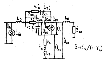 Рассчитываются комплексные амплитуды токов и напряжений на элементах эквивалентной схемы (см. Рисунок 4).
