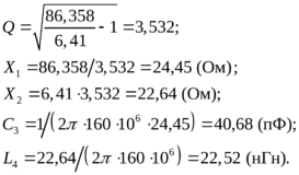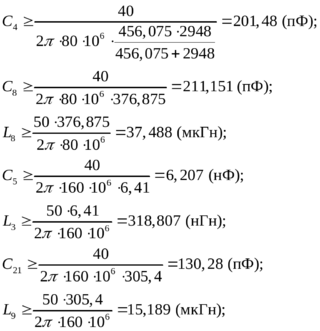 Согласующая цепь СЦ3 включает в себя фильтр-пробку на частоту fП=80 МГц, а также Г-образную цепочку согласования на частоте f=160 МГц. Расчёт фильтра-пробки на выходе удвоителя частоты выполним по формулам:
