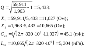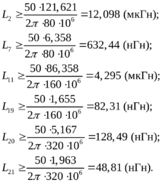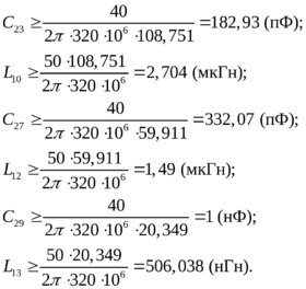 Согласующая цепь СЦ5 включает в себя фильтр-пробку на частоту fП=160 МГц, а также Г-образную цепочку согласования на частоте f=320 МГц. Расчёт фильтра-пробки на выходе удвоителя частоты выполним по формулам (150). Перед началом расчётов необходимо задаться емкостью CП. Пусть C35=CП=10 пФ. Произведя расчет по формулам (150) получим: