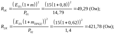 Произведя вычисления по формулам (164), (165), получаем RЕП1=225/(14,79+1,4+0,6735+0,4275+0,054)=12,972 (Ом), RЕП2=25/(0,046+0,035)=308,642. Мощность, потребляемая оконечным каскадом P01=14,79 Вт. Мощность, потребляемая предоконечным каскадом P02=1,4 Вт. Тогда с учетом модуляции, определим сопротивления каждого из этих каскадов по формуле вида (164). Для оконечного каскада:
