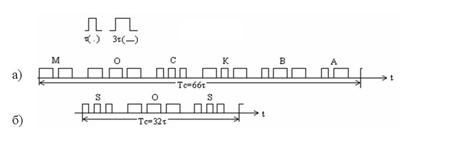 Длительность τ – между символами, 3τ – между буквами, 5τ – между словами. Последовательность комбинации коротких или длинных импульсов.