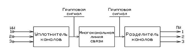Групповыми, называются сигналы, объединяющие информацию от нескольких источников, передаваемые по одной линии связи, называемой многоканальной.