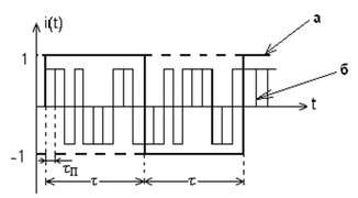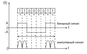 и амплитудой, принимающей значение «0, А» - униполярный цифровой сигнал или «-А; А» - бинарный цифровой сигнал, в соответствии с изображаемыми символами. «1» соответствует импульсу с длительностью τ и амплитудой А. «0» - амплитуда «-А» или «0». Различают биполярный и униполярный цифровой сигнал. Форма импульса может быть произвольной.