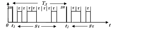 АИ модулятор формирует на выходе АИМ сигнал с непрерывной огибающей Ak(t). Устройство квантования осуществляет замену значений непрерывной огибающей Ak(t) дискретными значениями разрешенных уровней Aik(t). Кодер осуществляет замену каждого k-ого уровня квантования Aik(t) кодовой последовательностью импульсов соответствующего кода. Таким образом, в каждом периоде дискретизации ТД на выходе кодера формируется кодовая группа импульсов, длительностью τД, кодирующая уровень сигнала в данный момент времени. См. рис 39. Генератор импульсов (ГИ ДД1), собранный на двух ИМС (2xК155ЛА3), вырабатывает две последовательности импульсов – дискретизирующих (ИД) с периодом повторения ТД и тактовых (ТИ) с периодом ТТ, синхронизированных таким образом, что ТД = (N+1) ТТ, где N= ТД / ТТ - число уровней квантования, как показано на рис. 38, где N=8. Дискретизация аналогового сигнала команды Uy(t) осуществляется при помощи АИМ – модулятора, выполненного на ИМС ДД2, представляющей собой логический элемент (ЛЭ) “И”, на один из входов один из входов которого “0” (“низкого уровня”) подается сигнал Uy(t), на другой вход – “1” (“высокого уровня”) – импульсы дискретизации от генератора импульсов. Сигнал на выходе модулятора, соответствующий, уровню логической “1” ИМС, появляется при одновременном присутствии сигналов на обоих его входах [ДД2], как показано на рис.39.