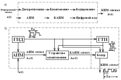 Операция квантования заключается в замене непрерывной шкалы мгновенных значений огибающей, дискретной шкалой разрешенных уровней. Вес – динамический диапазон непрерывной функции a(t), разбиваются на дискретные уровни. В каждый определенный момент времени мгновенное значение сигнала Akзаменяется ближайшим дискретным уровнем. Таким образом, аналоговый АИМ сигнал преобразуется в квантованный по уровню сигнал. Каждый уровень сигнала заменяется выбранным кодом, тогда схема преобразования сигнала, показана на рис. 35 а. Обобщенная функциональная схема устройства формирования импульсного сигнала может быть представлена в виде рис. 35 б.