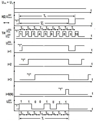 Таким образом, на выходе АИМ модулятора, формируется последовательность импульсов с длительностью τД, периодом ТД, и амплитудой U”1” равной уровню “1” ИМС ДД2, которая подается на вход “1” компаратора ДД4. На другой вход ДД4 – “0” подается напряжение управляющей команды Uy(t). Компаратор ДД4 содержит N арифметических логических устройств (АЛУ), вычисляющих разность уровней напряжений, поступающих на его входы. Каждый АЛУ имеет два входа и один “нулевой” выход. На один из входов АЛУ – “0” подается Uy(t), на другой - “1” – напряжение Ai (i=1,2,3... N) с одного из выходов N-элементного делителя напряжения на сопротивлениях R1, R2…RN, подключенного ко входу “1” ДД4. При равенстве напряжений на входах i-того АЛУ |Uy – Ai| = 0 на его i-том “нулевом” выходе появляется сигнал “1”. Таким образом в течение каждого импульса дискретизации τд на одном из выходов компаратора – ДД4 появляется напряжение уровня «1». Выходы компаратора – ДД4 соединены с адресными входами Ami горизонтальных строк ПЗУ – ДД5, в каждой из которых записан цифровой код i-того уровня квантования Ai. Каждая i-тая горизонтальная строка, содержит N элементарных ячеек памяти (ЯП), в которых записаны «1» и «0» цифрового кода, кодирующего уровня Ai. Единицы и нули, записанные в каждой ячейке i-той горизонтальной строки воспроизводятся на информационном выходе этой ячейки И2i (i=1,2, … N) при одновременном появлении импульса “1” на адресных входах этой ячейки Ami, Ani. Адресные входы горизонтальных строк Ami соединены с i-ыми выходами компаратора ДД4; адресные входы вертикальных строк Ani – c выходами счетчика импульсов СИ ДД3, информационные выходы ПЗУ ДД5 – с информационными входами мультиплексора МПЛ ДД6. Мультиплексор, представляет собой управляемый многопозиционный переключатель, выход которого подключается последовательно к одному из его входов при поступлении импульса “1” на управляющий вход. Таким образом, в течение одного ИД – τд импульс “1” появляется на адресном входе Ami какой – либо i-той горизонтальной строки и затем последовательно, через период ТИ – Tт, на адресных входах Ani отдельных ячеек этой строки, как показано на рис. 36, информационных выходах этих ячеек И2i , входах МПЛ ДД6, и на выходе АЦП. При этом на выходе АЦП последовательно воспроизводится “единицы” и “нули” ЦИС, кодирующего уровень Ai, записанного в i-той горизонтальной строке ПЗУ- ДД5 и соответствующего уровню передаваемой команды Uy. Каждый N-ый тактовый импульс подается с N-ого выхода счетчика импульсов ДД5 на его вход установки нуля R0, обнуляя счетчик, и через период Tт появляется следующий импульс дискретизации, и процесс повторяется в течение следующего импульса дискретизации. Для рассмотренной схемы N=8, и следовательно ПЗУ содержит 8 горизонтальных строк и 8 ячеек памяти в каждой строке и имеет объем памяти 64 бит, что позволяет использовать ее для кодирования 8-ми разрядным цифровым кодом аналоговый сигнал с шириной спектра Fm при настройке ИМС ГИ на ТТ ≈ 5*10-2 Fm-1 , τд = 8 ТТ, путём выбора номиналов сопротивлений и конденсаторов, подключаемых к выводам этой ИМС.