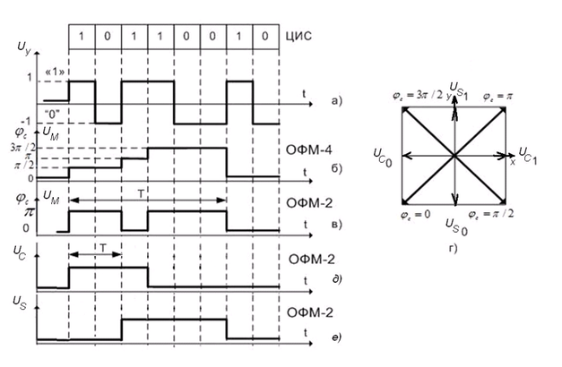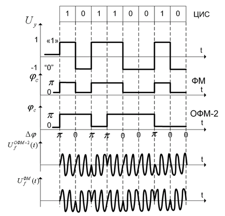 Для простой ФМ цифрового ИС фаза несущего колебания φ принимается равной строго определенному значению, в соответствии с уровнем управляющего, модулирующего напряжения Uу. Таким образом, φс=(0;π), что соответственно равно 0 и 1. При этом, для составления ЦИС в приемнике должно быть заранее установлено (до приема РС) абсолютное значение фазы несущего колебания, что значительно усложняет структуру радиоканала. При относительной ФМ ЦИС фаза несущего колебания в каждом тактовом периоде φсопределяется относительно ее значения в предыдущем тактовом периоде, то есть равна φс= Δφ, где Δφ – изменение фазы, скачок на границе двух последовательных периодов. При этом принимается Δφ =(0;π) для «0» и «1» соответствующего ИС.