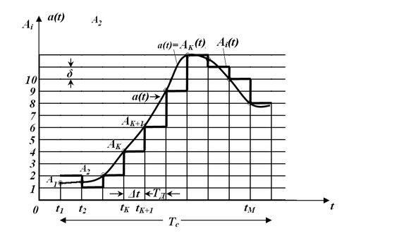 Дискретизация сигнала по времени заключается в замене непрерывной функции a(t) последовательностью ее значений – отсчетов в определенные моменты времени ti, отстоящих друг от друга на равные интервалы времени