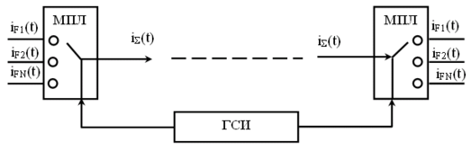 ис. 52. Формирователь группового сигнала с временным разделением каналовгде обозначено iFi(t) – информационные сигналы каналов; МПЛ – мультиплексор – многопозиционный переключатель, переключающий поочередно ИС iFi каналов, поступающих на его входы, на выход, соединенный с линией связи; ГСИ – генератор синхронизирующих импульсов.