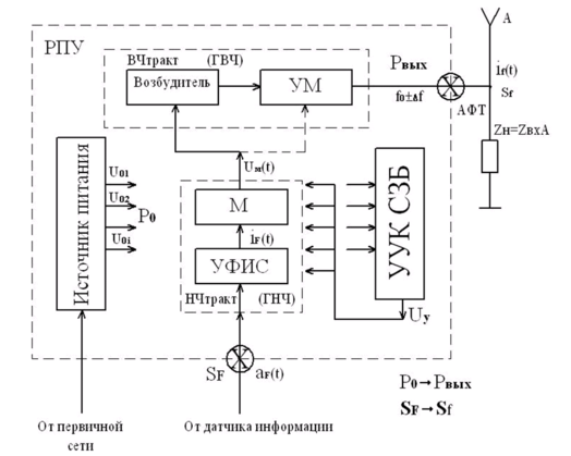 Временные и спектральные характеристики РС, if(t), Sf, синтезируются на выходе РПУ в результате преобразования энергии (или мощности P0), потребляемой от источника питания, в энергию (или мощность Рвых) выходных колебаний и переноса спектра SF первичного информационного сигнала aF (t) в окрестности несущей частоты f0. Таким образом, РПУ можно рассматривать как энергетический и частотный преобразователь: Р0