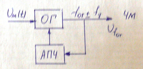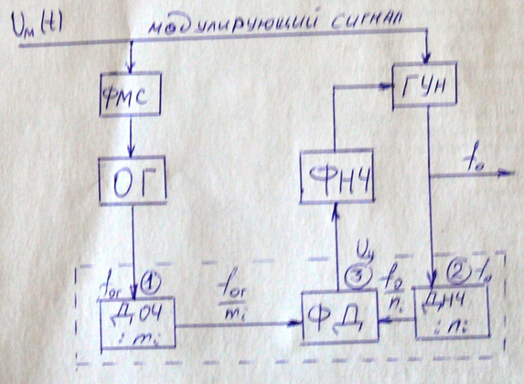 Модуляция частот в СЧ ПКС заключается в сопровождении стабильности его частоты, в модулированных СЧ ПКС – используется АПЧ. В схемах частот косвенного некогерентного синтеза – прямая ЧМ, сопровождаемая подачей модулированного напряжения одновременно на ОГ и ПГ, как показано на рисунке 67:
