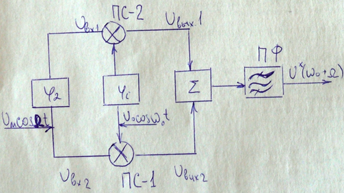 Основной элемент модулятор, осуществляет перемножение сигналов, на его входах. ВЧ – на несущей частоте
