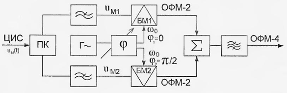 Балансные модуляторы БМ1, БМ2 формируют на выходе 2 ОФМ-2 сигнала, на частоте