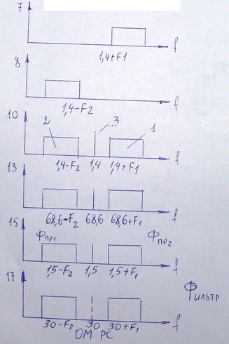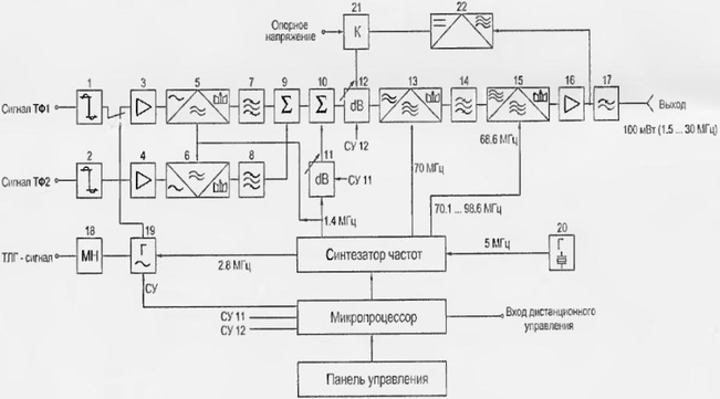Возбудитель формирует ОМ телефонные и ЧМ телеграфные сигналы в диапазоне частот 1.5 – 30 МГц с шагом перестройки 100 Гц и выходной мощностью Pвых = 100 мВт. Источником колебаний является опорный кварцевый генератор 20 с f=5 МГц. Синтезатор частот формирует сетку частот с шагом 100 Гц в диапазоне 70.1 – 98.6 МГц, частоту гетеродина 70 МГц для смесителя 13 и поднесущие частоты 1.4 МГц и 2.8 МГц для канала формирователя соответственно. Входные телефонные сигналы ТФ1 и ТФ2 через усилители 1,2,3,4 подводятся ко входам двух балансных модуляторов 5, 6. Модуляция осуществляется на поднесущей частоте 1,4 МГц. Кварцевые фильтры 7 и 8 выделяют верхнюю канале в ТФ1 и нижнюю в канале ТФ2 боковую полосу. Эти полосы суммируются в сумматоре 9 и 10 с поднесущим колебанием fП=1,4 МГц, уровень которого регулируется аттенюатором 11 в соответствии с регулируемым сигналом управления (СУ). Сформированный групповой сигнал с выхода 10 переносится в диапазон рабочих частот при помощи разностных смесителей 13,15 и фильтра 14, усиливается до необходимого уровня усилителем 16 и через фильтр 17 подается на выход.