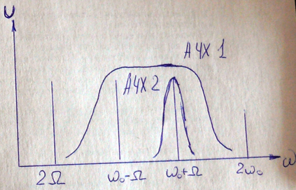 Эта схема обеспечивает высокую стабильность частоты УМ сигнала, при использованию простых и полосовых фильтров, за счет увеличения интервала между боковыми полосами выходного сигнала балансного модулятора: при соотношении несущей частоты балансовых модуляторов: