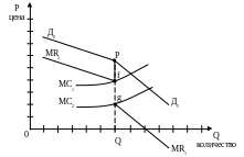 Изменение (сдвиг на графике) предельных издержек (МС) между МС1 и МС2 сократит вертикальный ( пунктирный отрезок fg кривой предельного дохода) . Никакого изменения в цене PQ ни в объеме производства Q не произойдет.