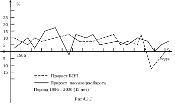 Состояние рынка внутреннего и внешнего АТ исследуют на основе аналитических данных по ВВП и пассажирообороту за определенный период предшествующий прогнозируемому (10, 15, 20, 25 лет), чем больше продолжительность периода, тем достоверней прогнозируемые расчеты. (рис4.3.1)