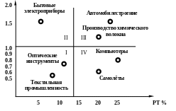 IV – те отрасли, куда предполагается инвестировать капитал для увеличения производительности труда (замена оборудования, разработка новых технологий). Низкая производителность, но высокий объём продаж.