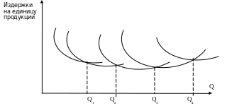 Укрупнение предприятий( концентрация производства )связано с понятием минимально-эффективным размером производства (Q3) при котором средние издержки минимальны. (рис. 7.1.1)
