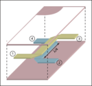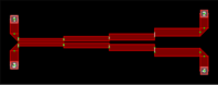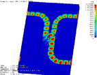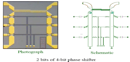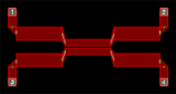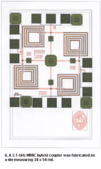 Рис. Шлейфный направленный ответвитель со сдвигом фаз между выходами 2 и 3 - 90° для частоты 2.1.ГГц на пленочных LC - элементах в виде монолитной интегральной схемы. Зеленым представлены пленочные конденсаторы.)