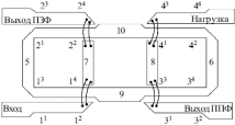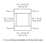 Входными плечами кольцевого моста являются 1 и 3, выходными (нагрузочными) – 2 и 4. От входа 3 к нагрузкам (диодам, транзисторам) поступают синфазные сигналы в широком диапазоне частот. От входа 1 к нагрузкам поступают сигналы со сдвигом фаз 180 ° ( 3/4 λ – 1/4 λ). Это существенно ограничивает частотный диапазон.