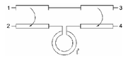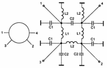 В делителях и гибридных соединениях каждый из трансформаторов – отрезков линии передачи определенной длины – заменяются на LC – элементы. Для кольцевого гибридного соединения необходимы отрезки линий различной длины: З/4λ и λ/4 . Они реализуются четырехполюсниками различного вида. Разность фаз между выходами 3 и 4 составляет 180° при подаче сигнала со входа 1 (сигнал со входа 2 делится синфазно между выходами 3 и 4).