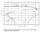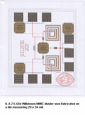 Рис. Двухканальный делитель мощности для частоты 7.5 ГГц на пленочных LC - элементах в виде монолитной интегральной схемы и ее амплитудно – частотная характеристика.