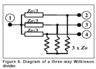 Одинаковые трансформаторы кольца делителя предопределяют равное деление мощности по каналам. Затухание мощности при делении (прямые потери) от входа 1 до выхода 3 определяется как