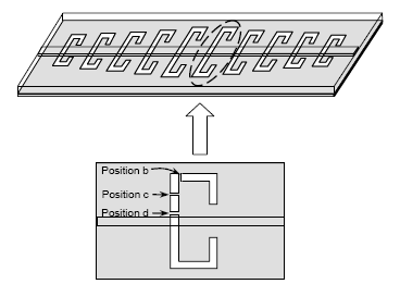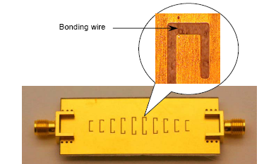 Рис. Фото обратной стороны микрополоскового ФНЧ с щелевыми резонаторами. Припаянные проволочки реализуют режим КЗ в месте подключения, укорачивая резонатор. Разрыв проволочки его удлиняет.