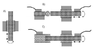 Рис. Два типа переменных нанорезистора – В), С), нанодрель, как пример реализации движущейся электромеханической системы – А).
