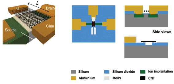 На нанотранзисторах можно создавать устройства с простыми схемными решениями, но с достаточно сложными функциями преобразования сигнала, например, смеситель на полевом транзисторе с подвешенным затвором. Для преобразования сигнала в этом смесителе используются нелинейные свойства полевого транзистора и нанотрубки. Если на управляющий электрод (затвор G) этого транзистора подать напряжение: