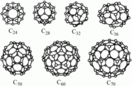 Фуллерены - это замкнутая сферическая структура молекулы С60. Элементарный углерод способен образовывать сложные вогнутые поверхности, состоящие из пяти-, шести-, семи- и восьми - угольников. Пятиугольники формируют 30о положительное искривление плоскости, шестиугольники (купол), семиугольники - 30о - отрицательное искривление плоскости (внутренняя сторона “бублика”), а восьмиугольник - 60о - отрицательное искривление плоскости (тоже внутренняя сторона “бублика”).