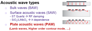 В упругой среде могут распространяться объемные (ОАВ) и поверхностные акустические волны (ПАВ). Для возбуждения объемных волн на пьезоэлектрике формируют пару широких электродов, а для поверхностных волн - несколько пар узких электродов. Для обратного преобразования акустических колебаний в электрические вторая пара электродов для ОАВ располагается на разных сторонах кристалла, а для ПАВ - на одной и той же.