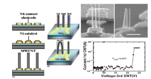 Рис. НЭМС - коммутатор на многослойных углеродных нанотрубках, выращенных на ниобиевых электродах при никелевом катализаторе.