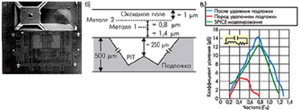 Рис. СВЧ CMOS-усилитель с подвешенной MEMS-катушкой индуктивности (а), поперечное сечение катушки индуктивности (в) и её характеристики усилителей с удалённым и неудалённым материалом подложки под катушкой индуктивности. (с).