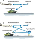 Рис. Обнаружение целей при облучении их радаром самолета-разведчика (а) и 'подсвечивающим' радаром (б)