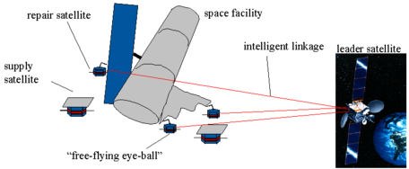 Free-flying miniature satellites (~1 kg) for inspection and repair of a space facility. Highly specialized micro-satellites are used to deliver supplies, perform robotic assembly, and collect or transmit video images. Requires frequent docking with other spacecraft to up/download data, reprogram, recharge batteries, refuel, deliver cargo, execute inspection / repair / construction missions.