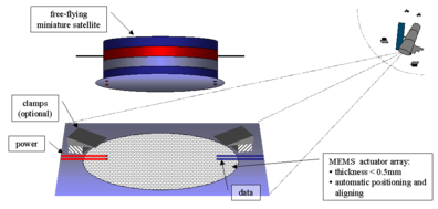 Docking system for miniature spacecraft (conceptual design). A MEMS actuator array aligns the approaching micro satellite with the docking area. Magnets or clamps generate the required normal force.