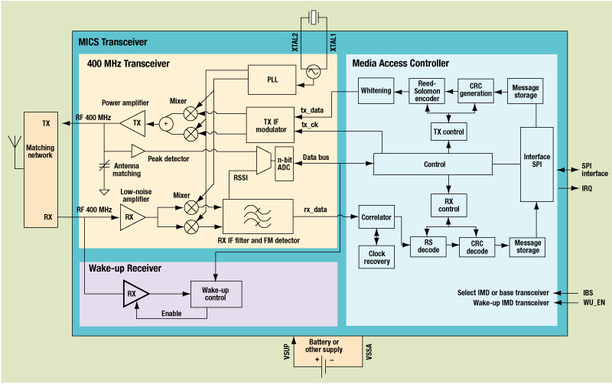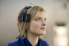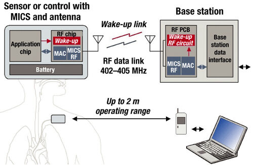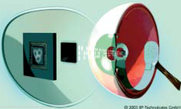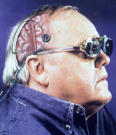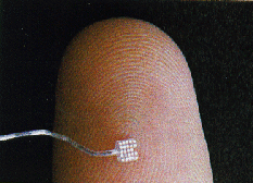 «Бионический» глаз с чипом. Для преодоления слепоты (при сохранении зрительного нерва) предполагается внедрение имплантантированного в сетчатку чипа (Implanted chip), на который подается сигнал с видеокамеры в оправе очков. Видеоинформация преобразуется в радиочастотный сигнал, который через первичную индуктивную антенну (Primary coil) принимается вторичной антенной (Secondary coil) в области хрусталика глаза. Таким образом, реализуется двухсторонняя беспроводная телеметрическая связь с самонастройкой. Чип представляет собой дискретную тактильную поверхность, каждый пиксел которой возбуждает сигнал определенного фоторецептора (photoreceptor) зрительного нерва (Retina). Глазные нервы стимулируются с помощью электрических разрядов.