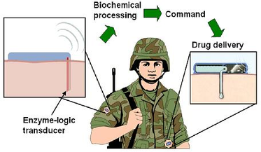 «Полевой госпиталь – на чипе » - фрагмент экзоскелета. Ферментный (enzyme) датчик передает данные на дистанционный биохимический процессор, где формируется сигнал на устройство введения лекарства.
