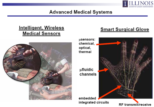 Рис. (А) - Медицинское диагностическое устройство с беспроводной информационной системой. (Б) – Хирургические перчатки с химическим, оптическим и температурным сенсорами, каналами подачи реактивов, приемопередатчиком.