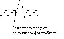 Минимальный размер определяется длиной волны используемого света. Длина волны видимого света 0,35 – 0,7 мкм; ультрафиолетового излучения (УФ) – 0,1 – 0,3 мкм. УФ позволяет получить с помощью контактной фотолитографии минимальный размер l = 0,1 мкм из-за размывания границы тени от фотошаблона.