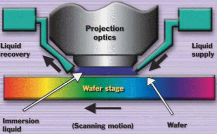 Методика иммерсионной литографии подразумевает погружение кремниевых пластин в очищенную воду. Применение воды в этом процессе объясняется тем, что она имеет более высокий коэффициент преломления, чем воздух, что, в свою очередь, позволяет добиться увеличения разрешающей способности литографии без изменения длины волны источника излучения.