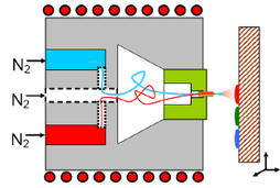 «На след луча» Без маски вещество можно наносить или удалять с помощью остро сфокусированного энергетического воздействия. Под воздействием лазерного излучения происходит разложение газообразных элементоорганических соединений, содержащих в своем составе требуемого вещество. Это могут быть металлы, полупроводники, диэлектрики. Они выделяются из соединений как твердая фаза и осаждаются на подложку только в месте прохождения луча. Оставшаяся часть соединения по-прежнему находится в газообразном состоянии и уносится потоком.