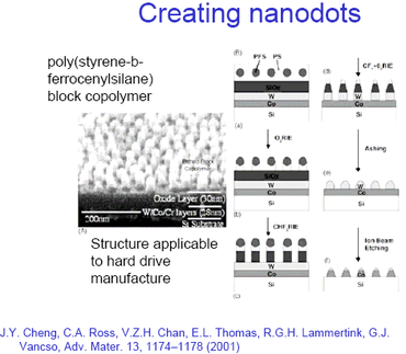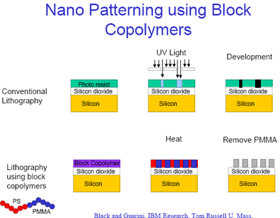 При обычной литографии облученные ультрафиолетом участки фоторезиста вытравливаются. При нанесении рисунка методом самосборки двублочный сополимер нагревается, и его составляющие разделяются и образуют строгий узор. Потом плексиглас удаляется травлением. Полученная структура переносится на двуокись кремния, а затем отверстия заполняются нанокристаллическим кремнием (на рис. не показано).