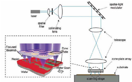 Поверхность подложки (Wafer) покрывается резистом (Resist), который не защищается маской с рисунком, а экспонируется фрагментом луча лазера. Фрагментированные лучи направляются на подложку помощью пространственно – лучевого модулятора (ПЛМ) (spatial-light modulator). Луч лазера рассеивается коллиматорной линзой (collimating lens) и подается на ПЛМ. ПЛМ представляет собой матрицу управляемых микрозеркал. Именно они фрагментируют расширенный луч лазера. Каждое из микрозеркал с помощью привода (электростатического, термоэлектрического, термического на материале с памятью формы) направляют фрагментированный луч на определенную точку поверхности подложки для ее экспонирования или в сторону поглощающего экрана.