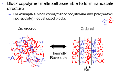 двублочный сополимер, в котором два полимера - полистирол и полиметилметакрилат (плексиглас) соединены химическими связями. При нанесении на вращающуюся кремниевую подложку они сегрегируют, словно масло и вода, но связи между ними сохраняются. Последующая тепловая обработка усиливает этот процесс, и в результате образуются маленькие цилиндры из плексигласа, окруженные со всех сторон полистиролом. Таким образом, двублочный сополимер сам по себе формирует готовый сотообразный шаблон.